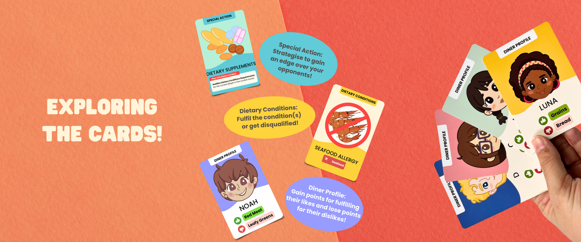 The goal? Be the FIRST to collect 5 Diner Profile cards by whipping up the highest-scoring balanced meals in each round.