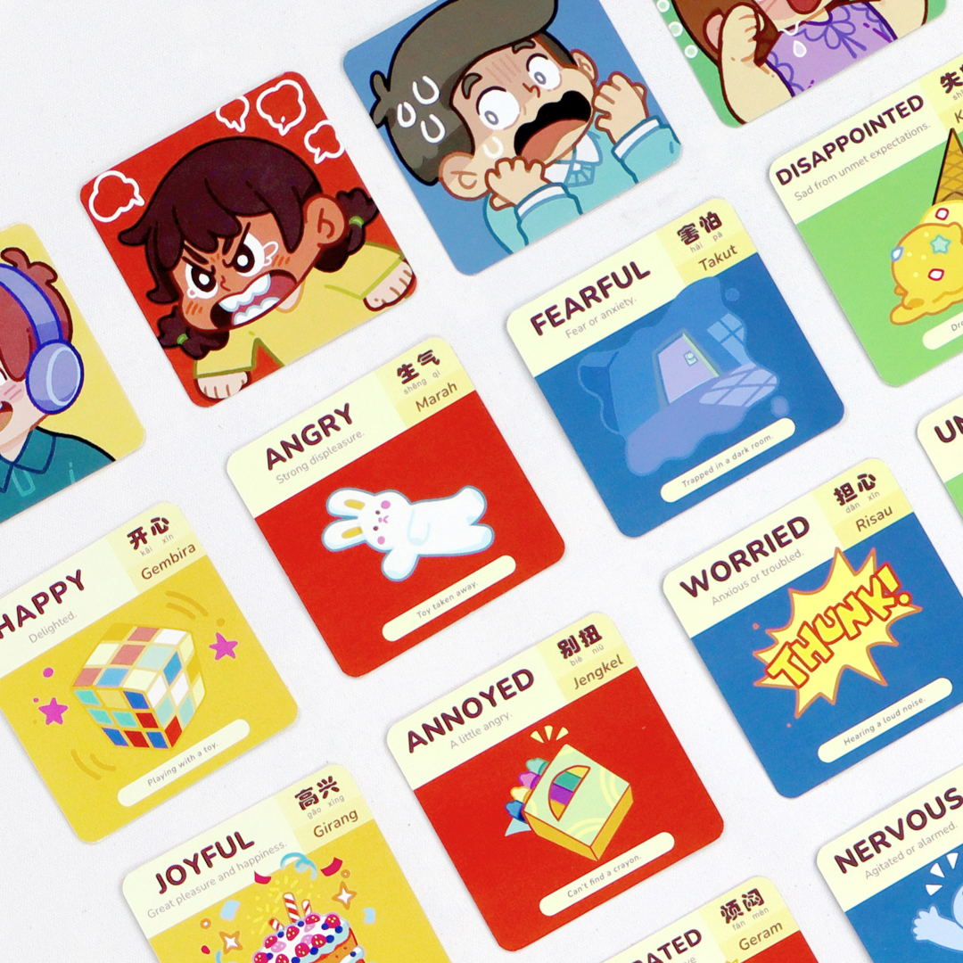 16 flash cards to distinguish a spectrum of emotions from positive to negative. They can be used as game materials in some worksheets, as well as on their own. Each flash card contains the emotion's English name and definition, as well as its Chinese and Bahasa Malaysia name.